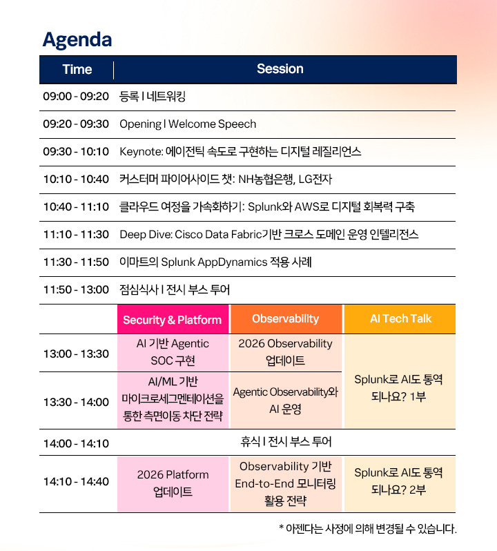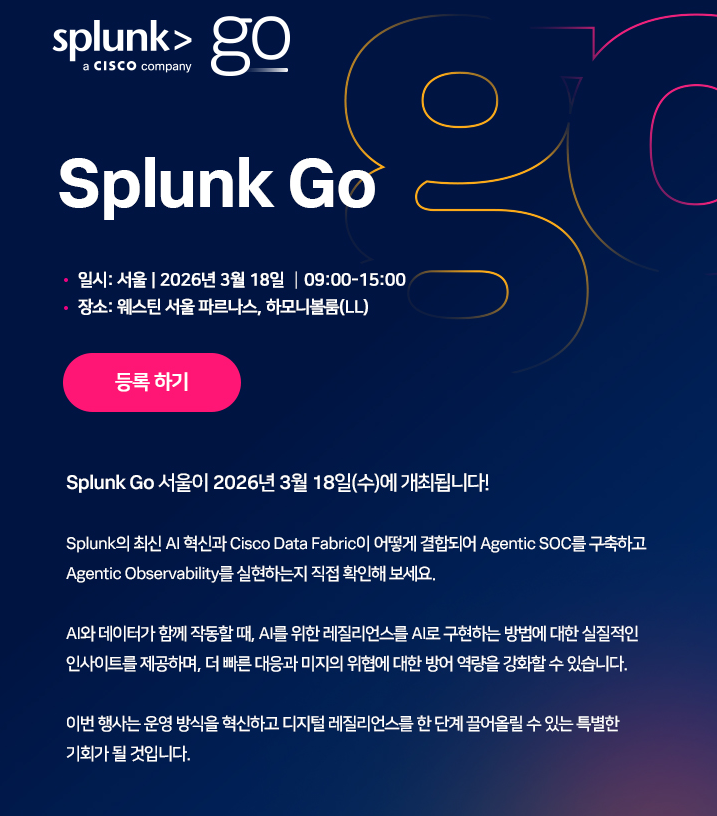 λ°λ‘ μ€λ 3μ 18μΌ(μ)μ κ°μ΅λλ “Splunk Go Seoul”μμ μμμνκ² νμΈνμ€ μ μμ΅λλ€.